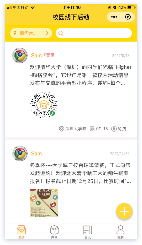 嗨格校会小程序,为校园提供生活服务社区。也许是第一款校园活动信息发布与交流的平台型小程序。